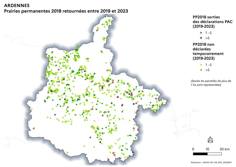 Les prairies permanentes 2018 "perdues" correspondent aux parcelles non déclarées en prairies permanentes lors des campagne PAC suivantes (2019 à 2023) ou qui sortent des déclarations PAC, pour lesquelles le devenir est incertain.